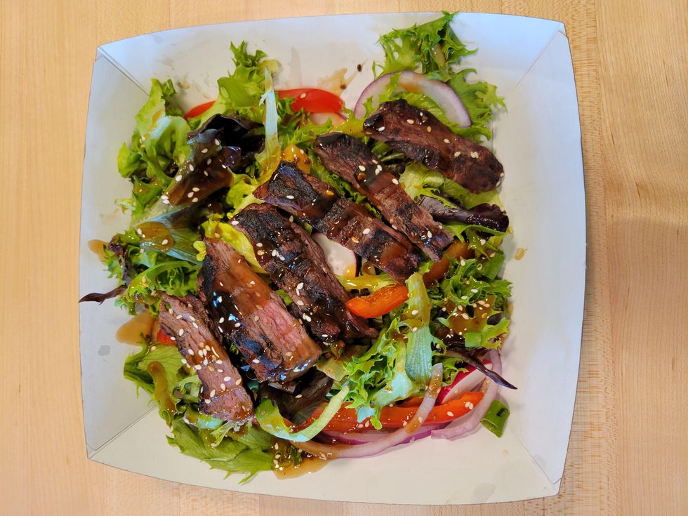 Entre la bavette de bœuf et la cuisse de poulet rôti, j'ai opté pour le bœuf comme protéine à ajouter à cette salade. Je n'ai vraiment pas été déçue. C'est même ma salade favorite parmi celles que j'ai essayées.
