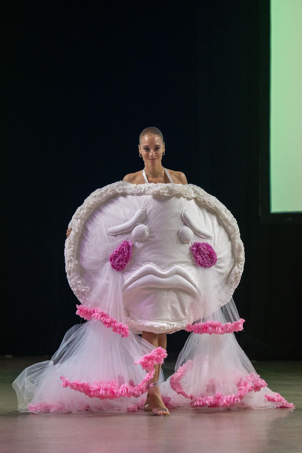 Le designer montréalais Tristan Réhel s'est inspiré de l’émotivité et de la sensibilité associée à son signe astrologique, le Cancer, pour sculpter une robe en forme de visage en pleurs géant.