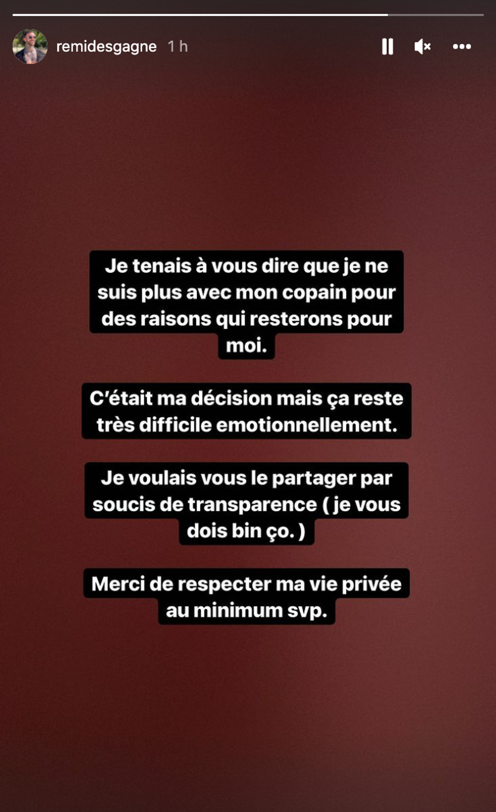« Suite à une décision sortie de nulle part après tout ce qu'on postait ensemble, Rémi a décidé qu'il était temps de mettre fin à notre relation pour l'instant. Ce genre de ruptures avec des "je t'aime, tout est parfait". Celles qui sont plus difficiles à passer au-dessus parce qu'au fond, tu as toujours espoir de se retrouver... »