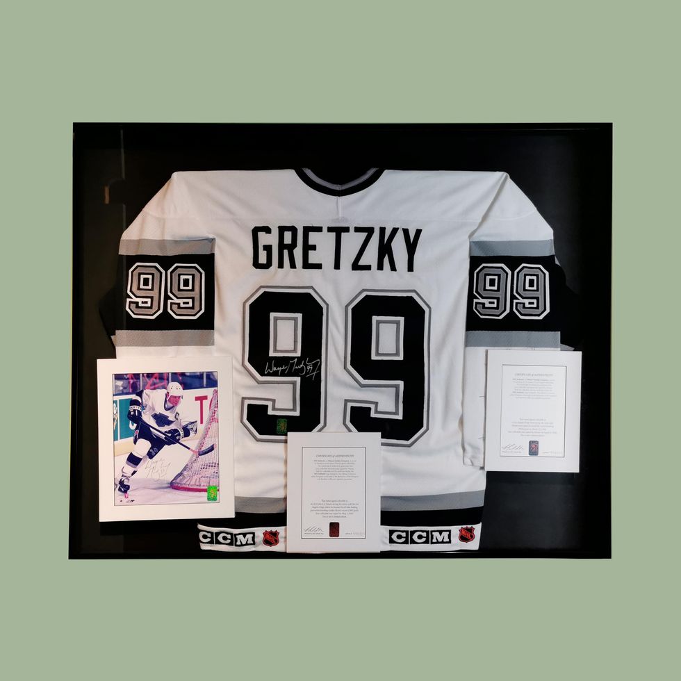 Details: The framed display includes a Los Angeles Kings jersey and photograph signed by hockey legend Wayne Gretzky. It also comes with a letter of authenticity.