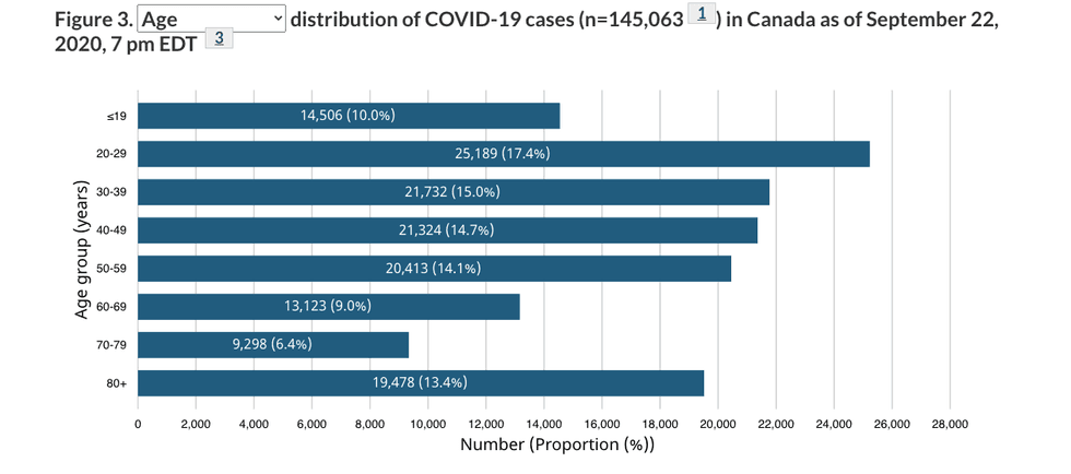 The math is simple, the age group of 40-80-year-old has had more cases than the 0-39-year-old range, meaning the current uptick with young people hasn't yet surpassed the presence of this disease among seniors that Canada experienced early on.