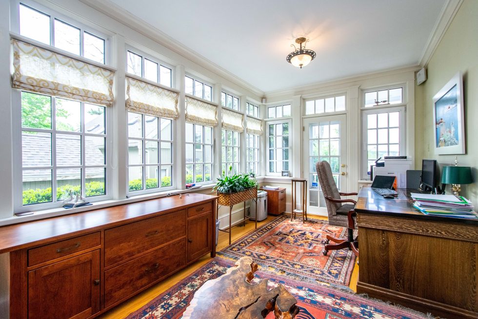 Inside, there is still that air of grandeur that the home had when it was originally built thanks to multiple woodburning fireplaces, beamed ceilings and large windows.