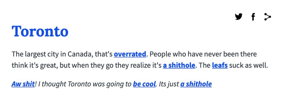 While Urban Dictionary has plenty of pleasant definitions for "Toronto," naturally, they're not all nice.