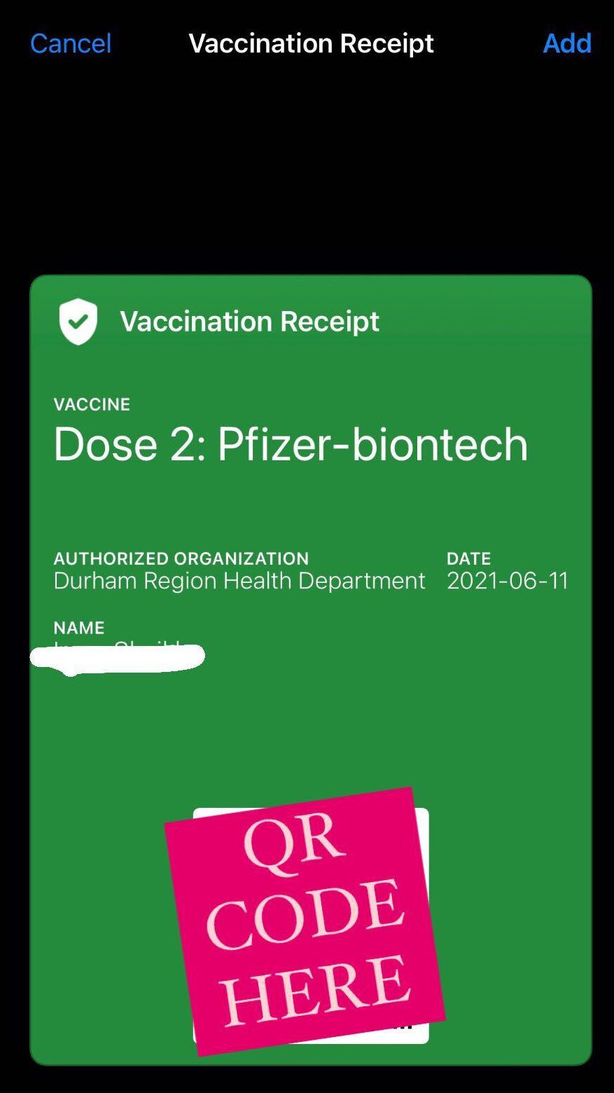 It contained no private data except my name, the vaccine I took, and the date it was administered. Plus, a QR code!