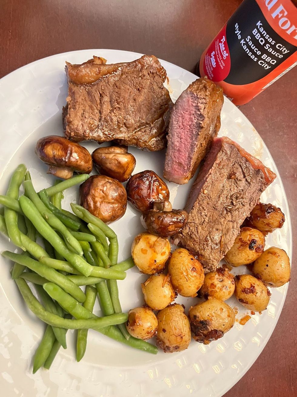 Because I was cooking for my family of four, I fried up three different cuts — the boneless bison striploin, the Canadian AAA Angus beef boneless New York striploin, and the Canadian AAA Angus beef T-bone — and slathered on some Wild Fork barbecue sauce.