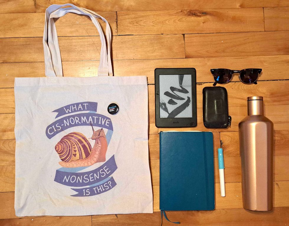 I was very excited to receive the tote bag featuring this design by Harry Grace. The snail demanding "what cis-normative nonsense is this?" made me laugh out loud. It also summarizes how I feel about tissues branded "for men," among other things.