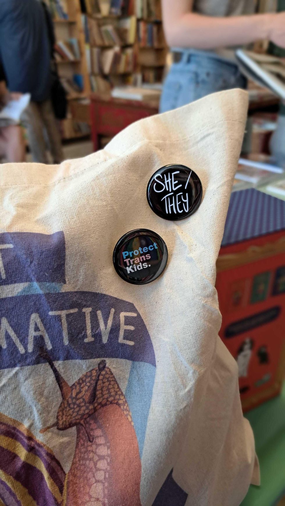 The second pin features a design by Fishbiscuit in support of trans kids. It’s a matter I care about deeply, and I’m glad to be able to support a Queer artist and display this message at the same time.