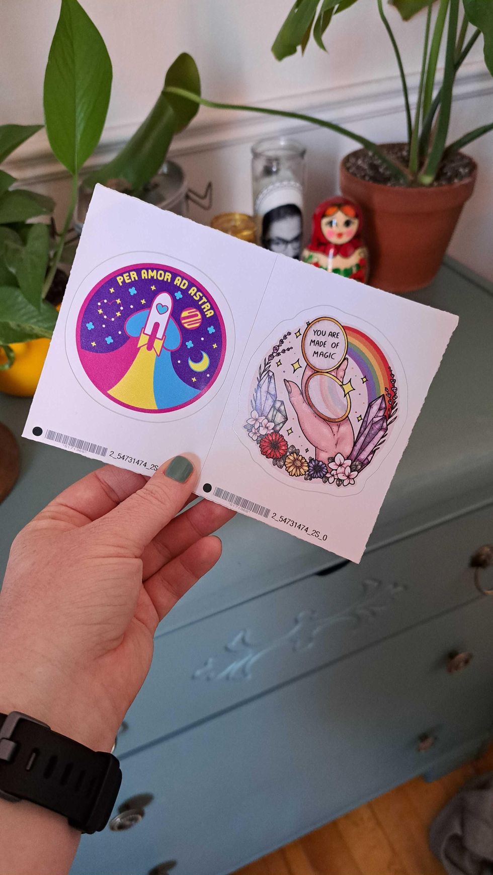 Speaking of stickers, I also picked up these two lovely designs. An artist called Wandering Kotka created the "Space Pride" sticker, which is available in several different colours, each representing a different Queer identity. Mine features the pansexual pride colours with text that reads "through love to the stars" in Latin.