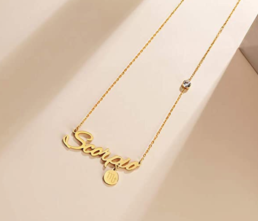 Details: This bold piece of bling isn't your typical calligraphy necklace. It features a dangling Scorpio sign charm and a rhinestone on one side that makes it look more unique, just like your bestie.