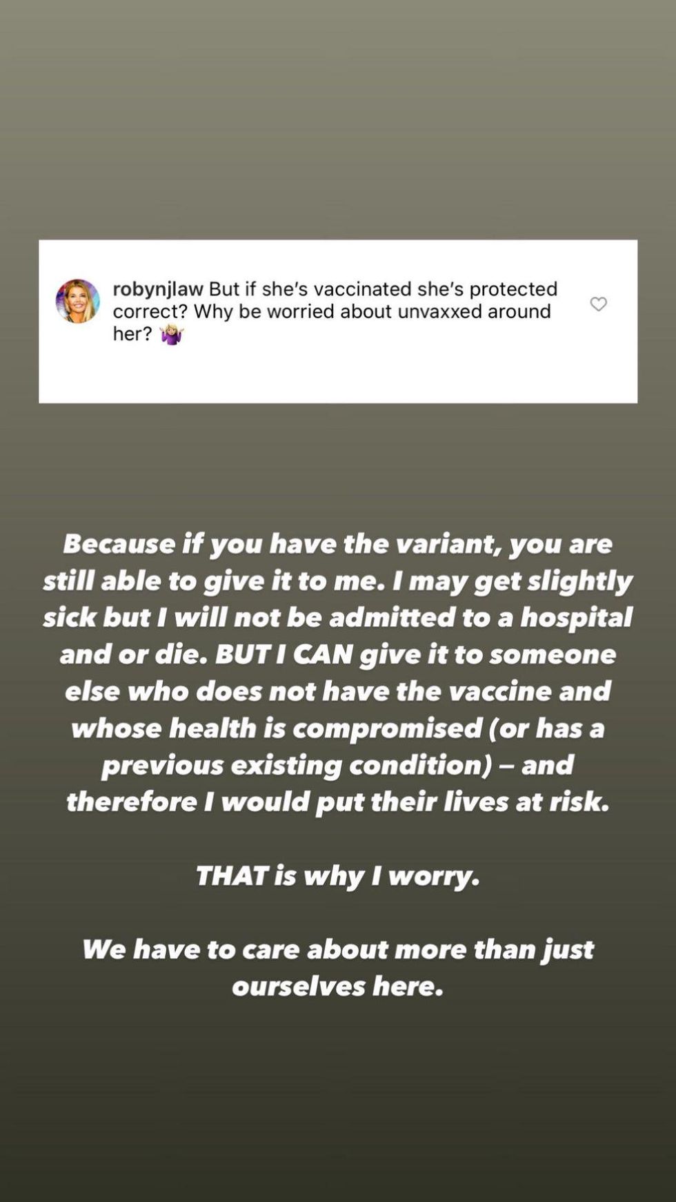 "I may get slightly sick but I will not be admitted to a hospital and or die. BUT I CAN give it to someone else who does not have the vaccine and whose health is compromised (or has a previous existing condition) — and therefore I would put their lives at risk," she said. "We have to care about more than just ourselves here."
