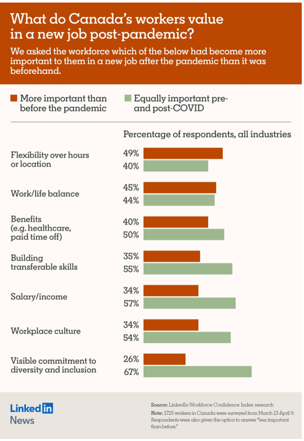 The LinkedIn Workforce Confidence Index explores what factors Canadians value most when looking for a new role and a lot has changed thanks to the COVID-19 pandemic and the shift to working from home.