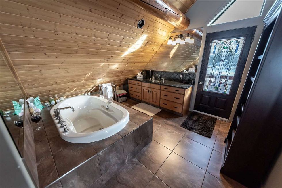 Here, you can relax in a luxurious tub fit for a northern king and queen surrounded by rustic wood. You also have the option to look out into nature thanks to a balcony inches away.