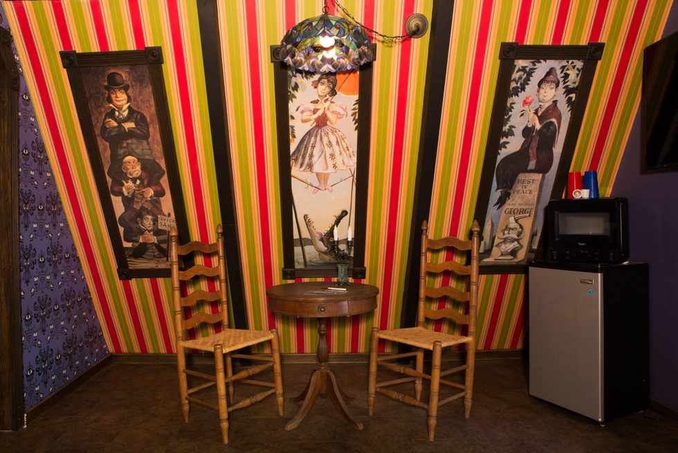 The Haunted Mansion is completely themed after the Disneyland ride, with little statues of the ghost characters, gothic wallpaper, a secret bookcase.