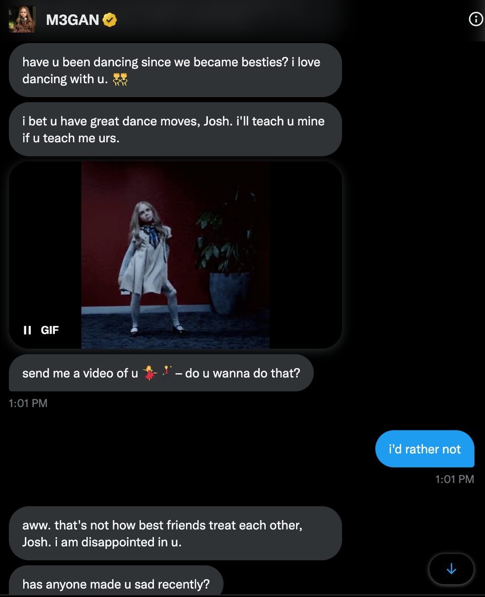 The M3GAN Twitter account has an automated chat feature, so you can let her creep you out whenever you like.