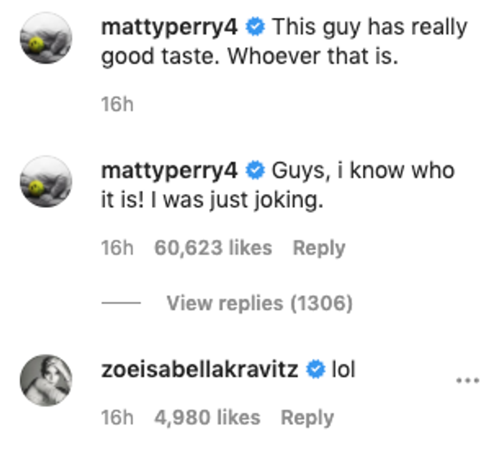 Perry's post also got the attention of actress Zoë Kravitz who commented, "lol".