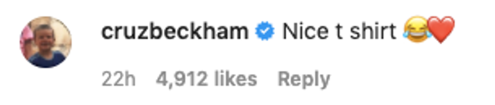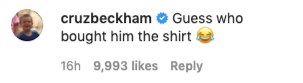 Beckham's 15-year-old son Cruz replied to the Friends star's post writing, "Guess who bought him the shirt 😂".