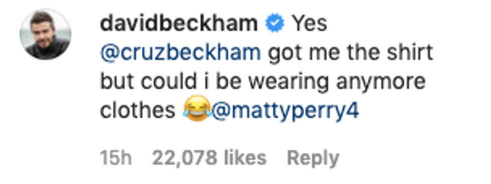 Beckham’s comment on Perry’s post reads, "Yes @cruzbeckham got me the shirt but could i be wearing anymore clothes 😂 @mattyperry4".