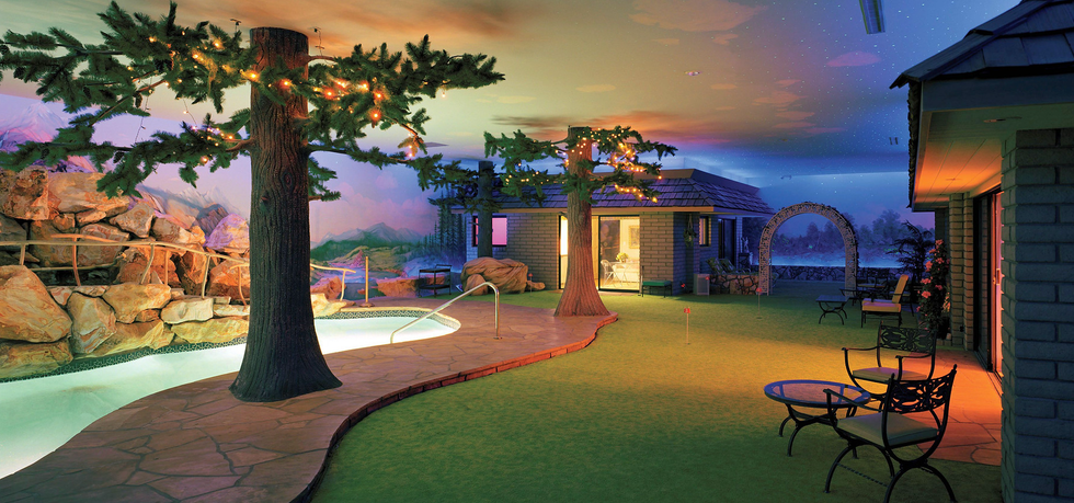 Built by a man named Jerry Henderson in 1978, the main house has two bedrooms, three bathrooms, a dance floor, a pool, a four-hole putting green, two hot tubs, a sauna, and a bar.