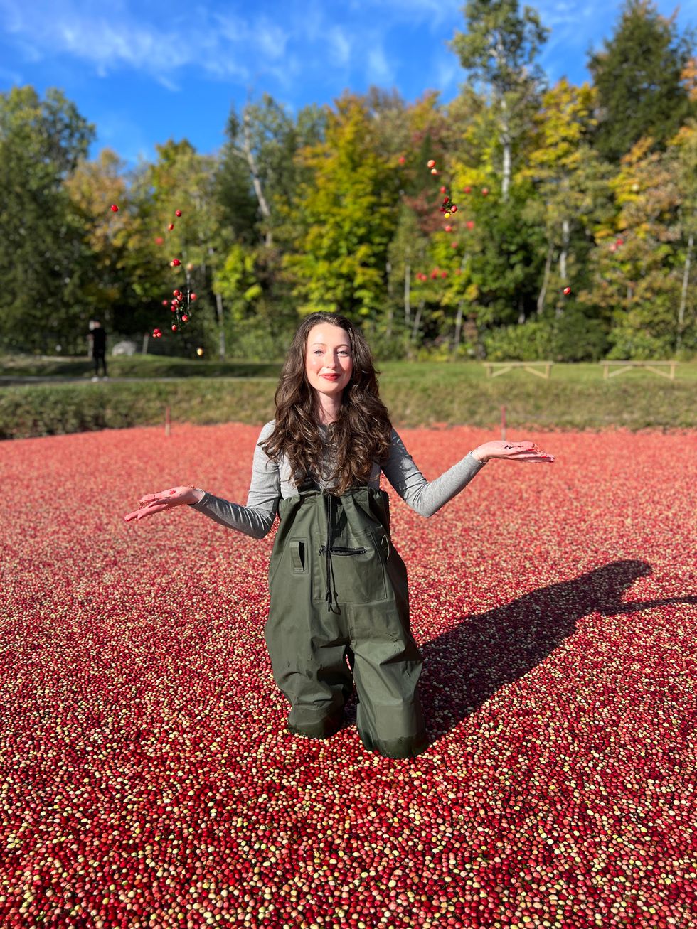 The experience allows you to wade through a vibrant sea of cranberries surrounded by stunning golden trees.