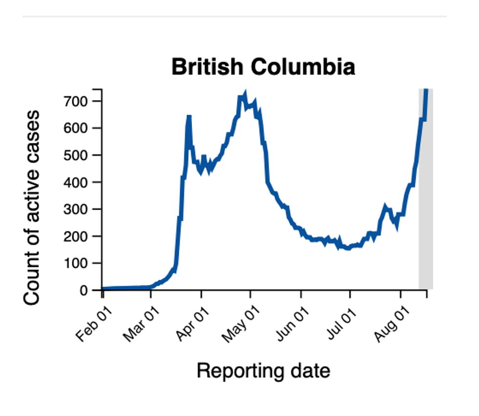 In fact, B.C. just had the largest single-day jump in the province so far, and recorded 236 new cases between August 14 and August 17.