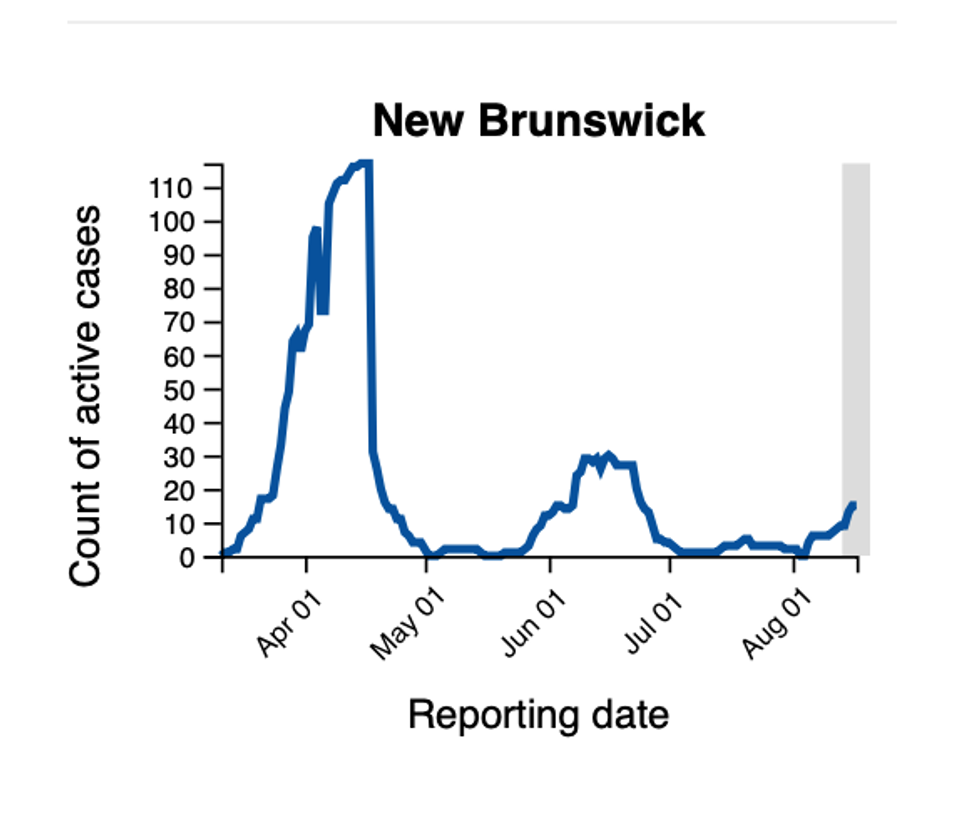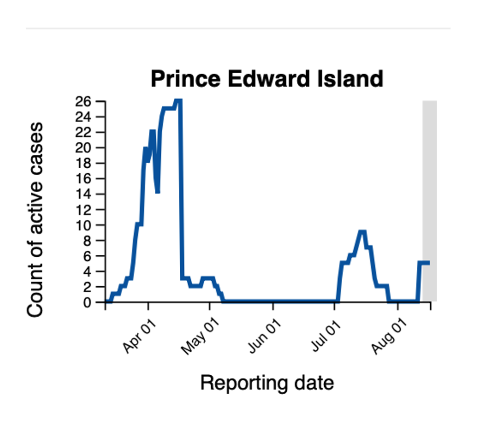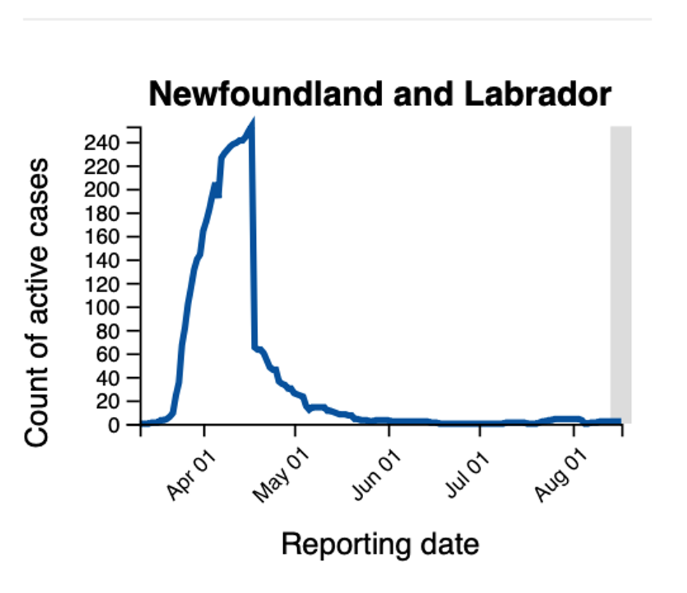 There continue to be positive signs in Newfoundland and Labrador. The region has not reported a single new case since August 10.