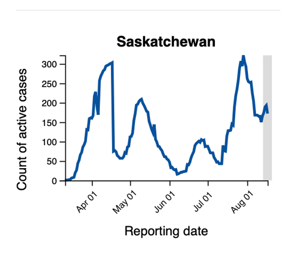 After reporting only a small number of COVID-19 patients in early-July, Saskatchewan's daily statistics have generally remained in double-figures, reaching 30 new cases on August 14.