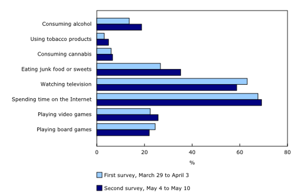 Almost a fifth of Canadians said they've been drinking more alcohol, and 35% say they've been eating more junk food. The same survey says that younger people between 15 to 24 reported more symptoms of anxiety than older age groups.
