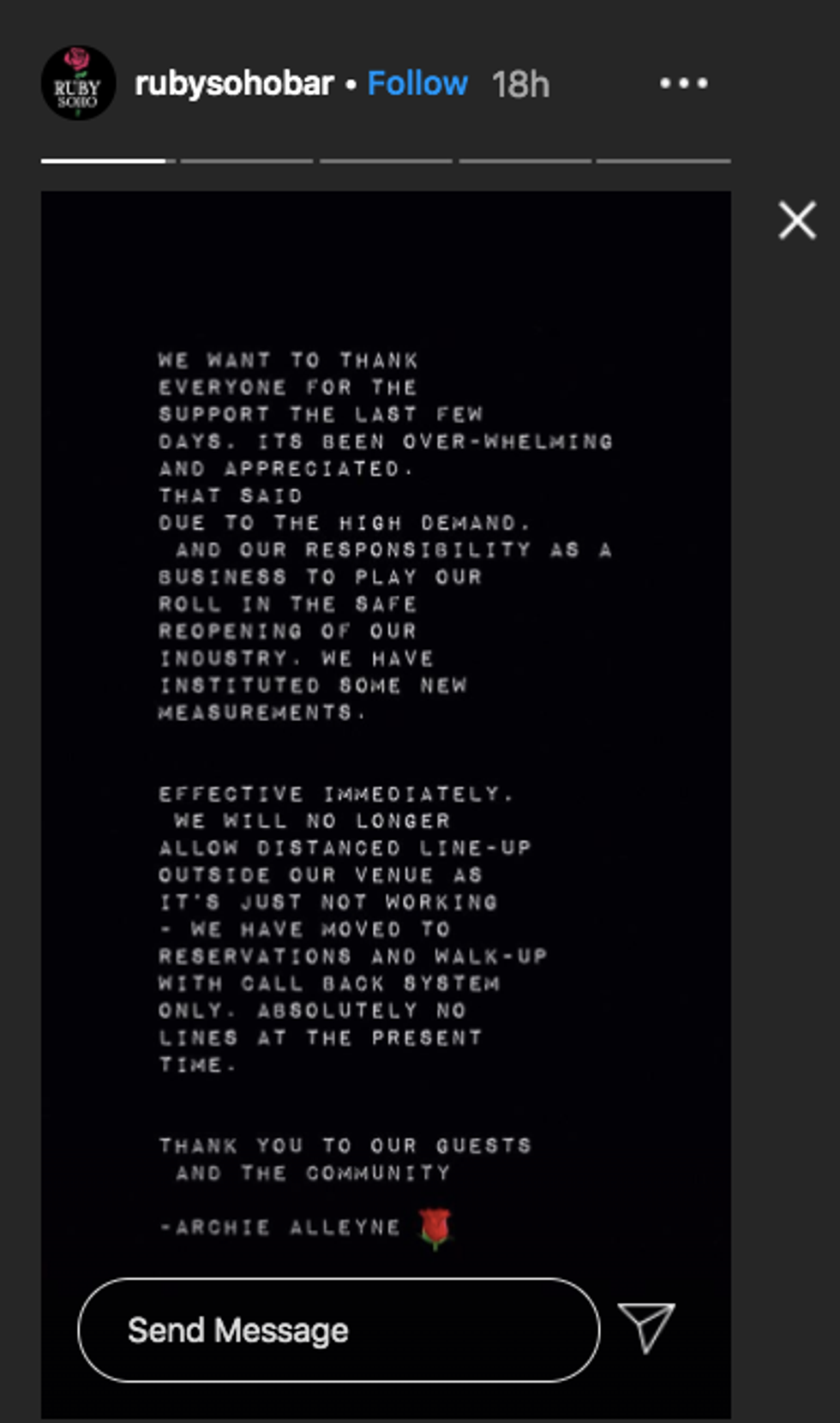 “We want to thank everyone for the support the last few days. Its been over-whelming and appreciated. That said due to the high demand, and our responsibility as a business to play our role in the safe reopening of our industry, we have instituted some new measurements,” read a statement from Ruby Soho.