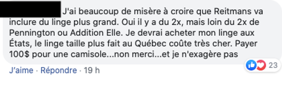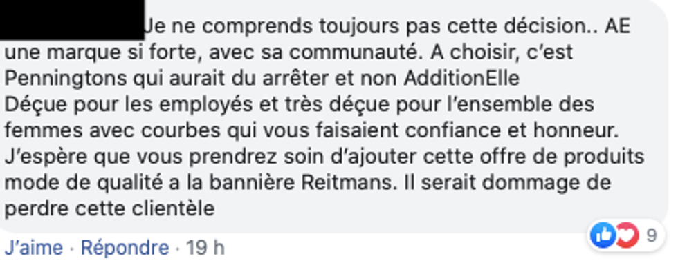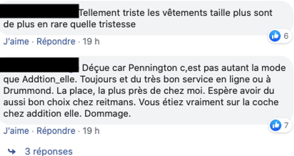 Sur Facebook, Addition Elle tente tout de même de se faire rassurante et a affirmé que les équipes de la marque travaillent en collaboration avec Reitmans et Penningtons pour améliorer leur offre grande taille.