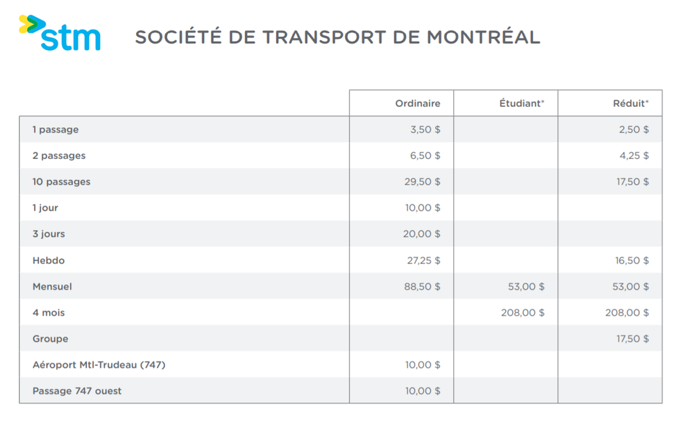 Elle a rendu publiques les grilles tarifaires d'exo, du Réseau de transport de Longueuil (RTL), de la Société de transport de Montréal (STM) et de la Société de transport de Laval (STL).