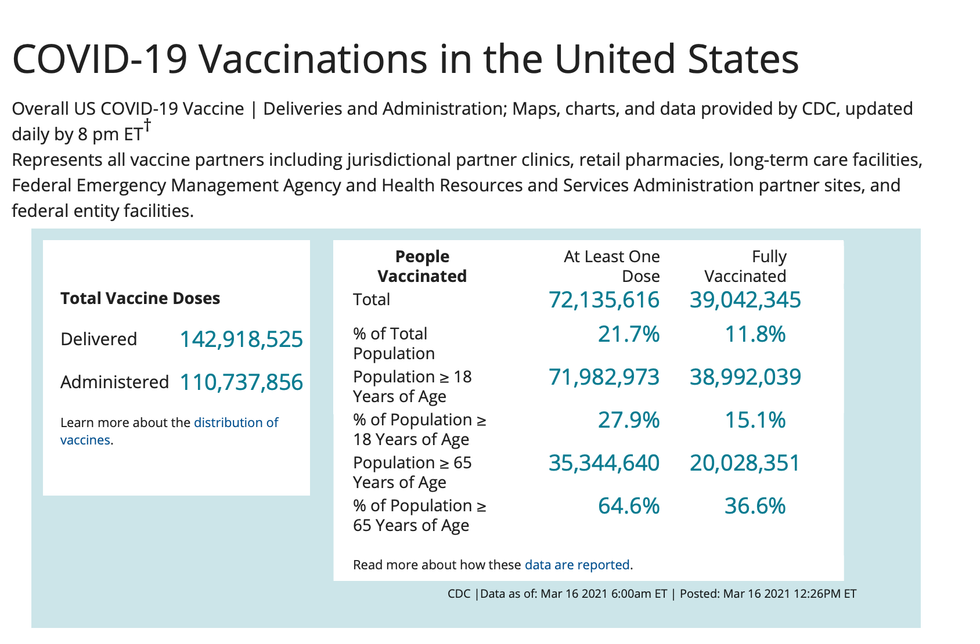 As of Wednesday, March 16, 39,042,345 people in the country had received both doses of their COVID-19 vaccine — around 11.8% of the population.