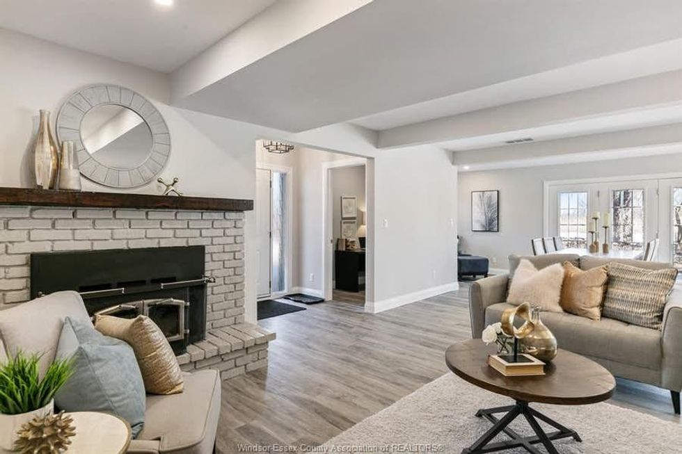 The bright interior features three bedrooms, a large fireplace, and open-concept living.