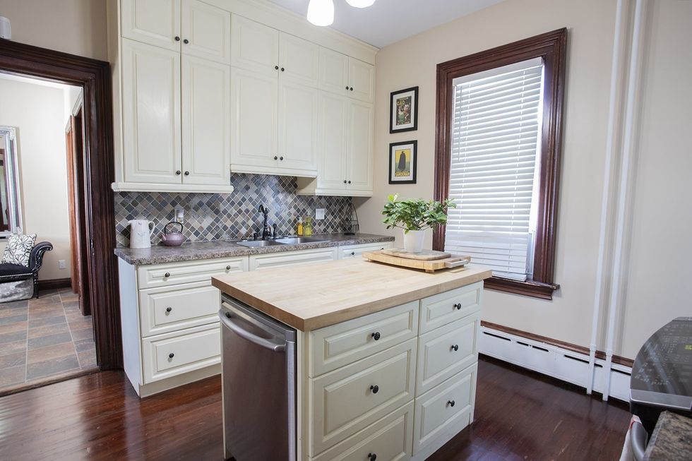 The central island provides extra counter space for prepping meals, and the lovely tile backsplash behind the stove and sink adds a dynamic look. There's also plenty of cabinet and drawer space.
