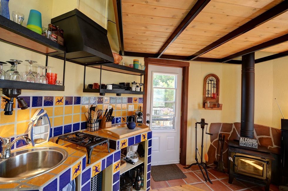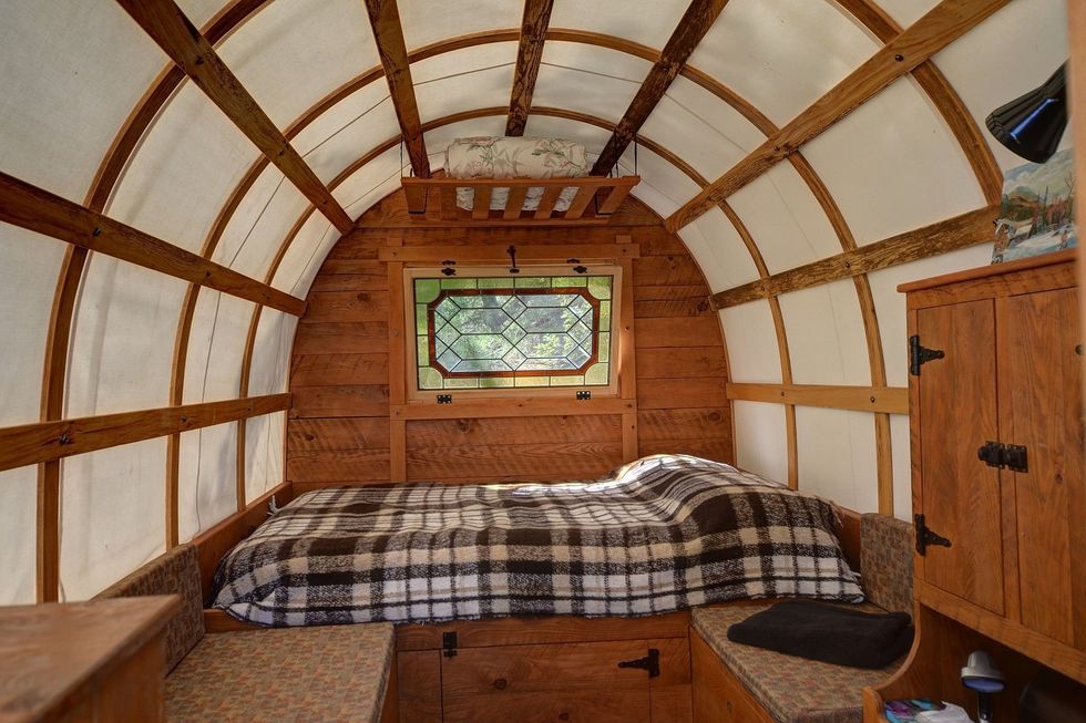 Description: This island oasis comes with a cottage made out of a grain bin and a unique wagon you can sleep in.