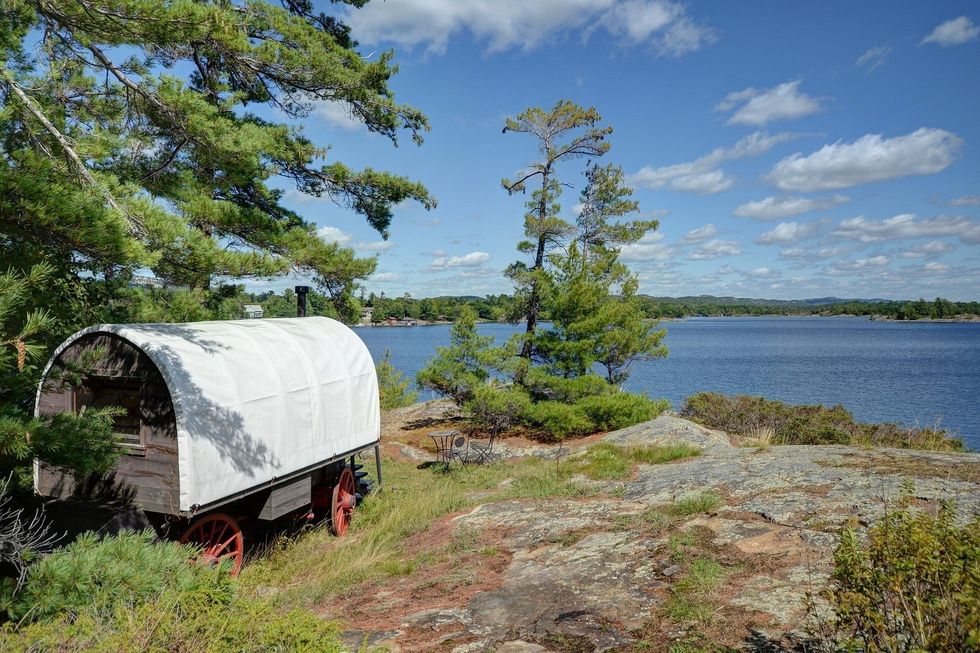 This $670K Island In Ontario Has A Fairytale Cottage & Covered Wagon You Can Sleep In