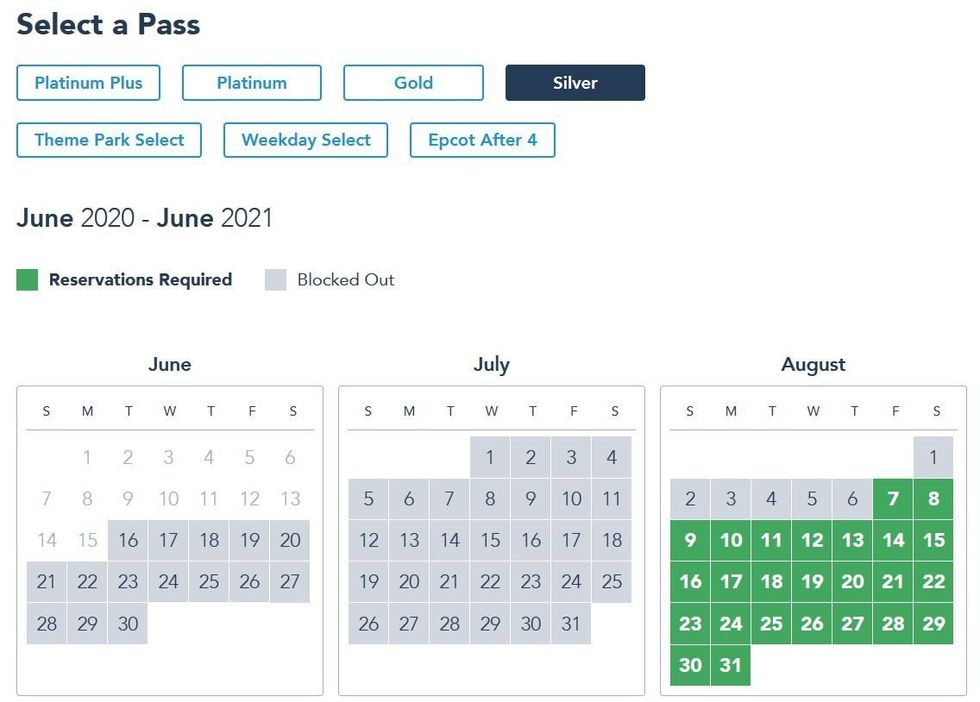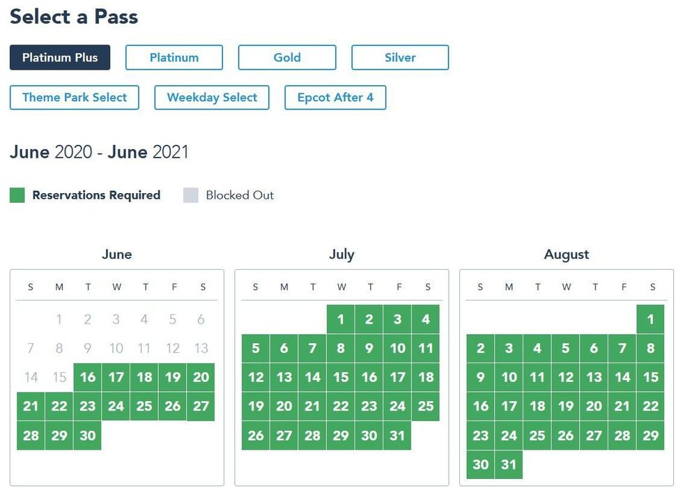 Each pass type has different dates available that are listed, with Platinum pass dates snaggable as early as the July reopening, and dates for the standard Weekday Select passes not offered until at least the first week of August.