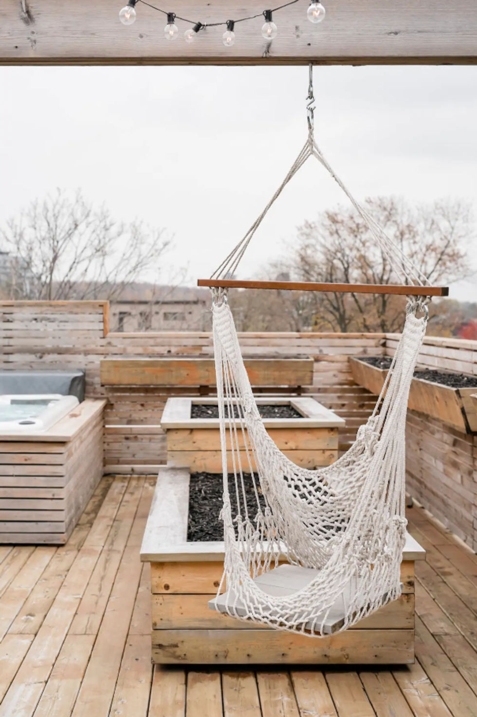 Lounge chairs, chic couches, and a macrame swing provide ample seating on this dreamy rooftop oasis.