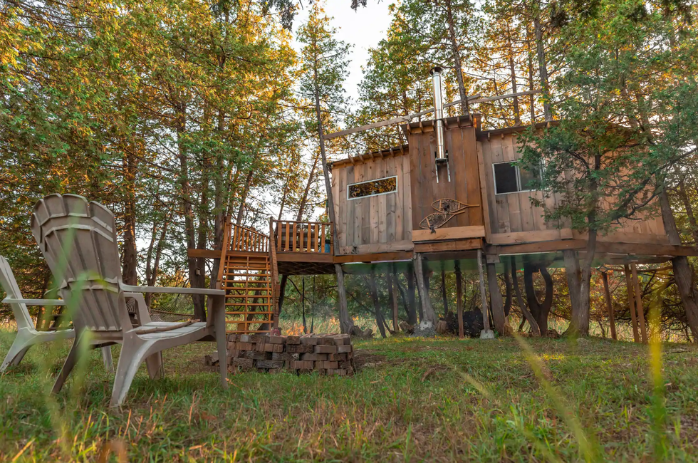 The treehouse towers nine feet in the air and features a woodburning stove that will keep you warm and toasty all year long.