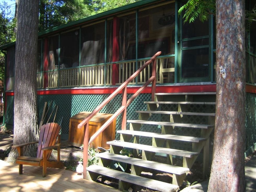 A steep staircase leads from the main cottage down to the floating yellow-and-red dock house.