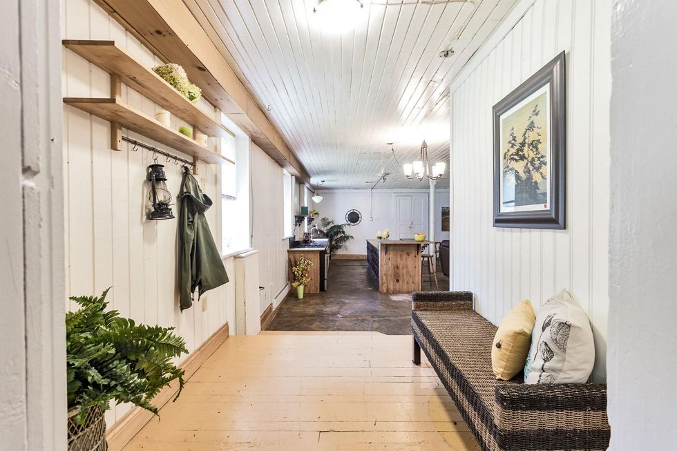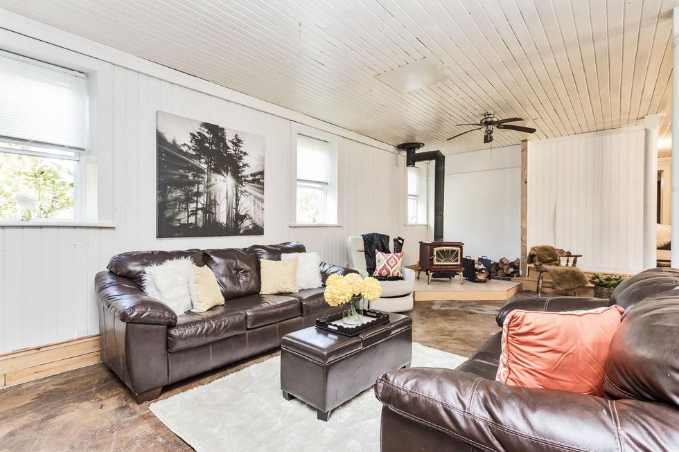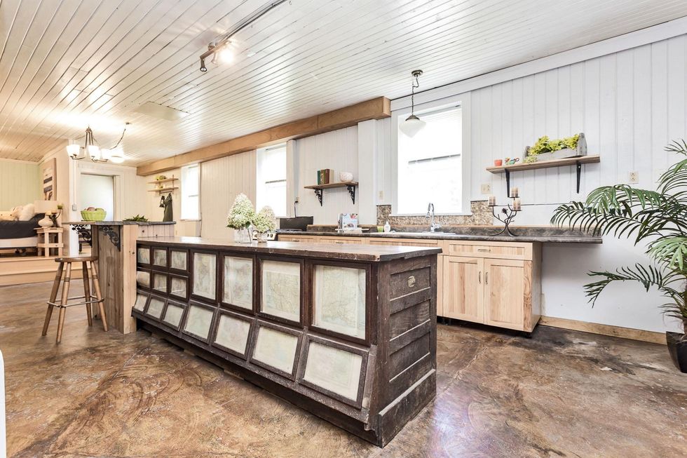 Built in 1912, the home has an open-concept lower level with a wood stove, sleek countertops, and a comfy sitting area.
