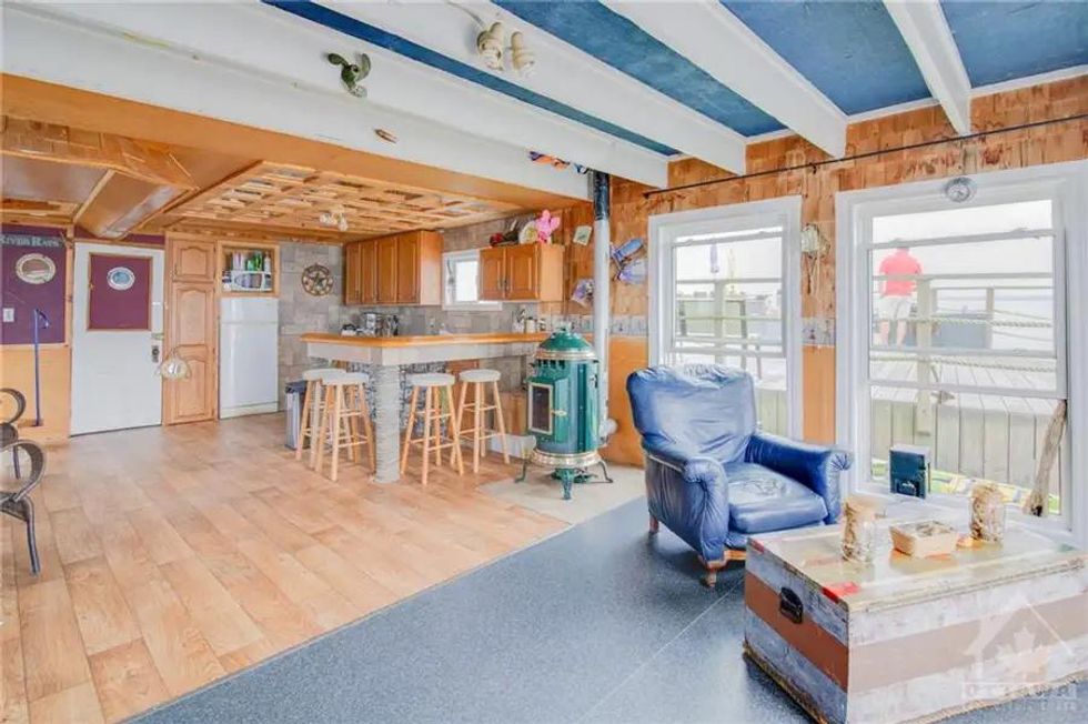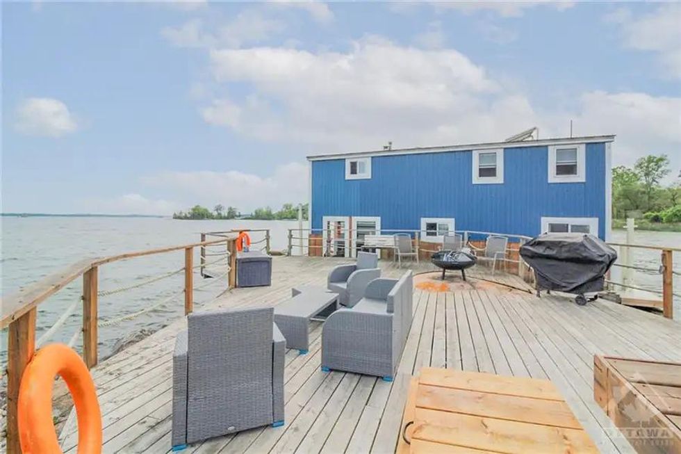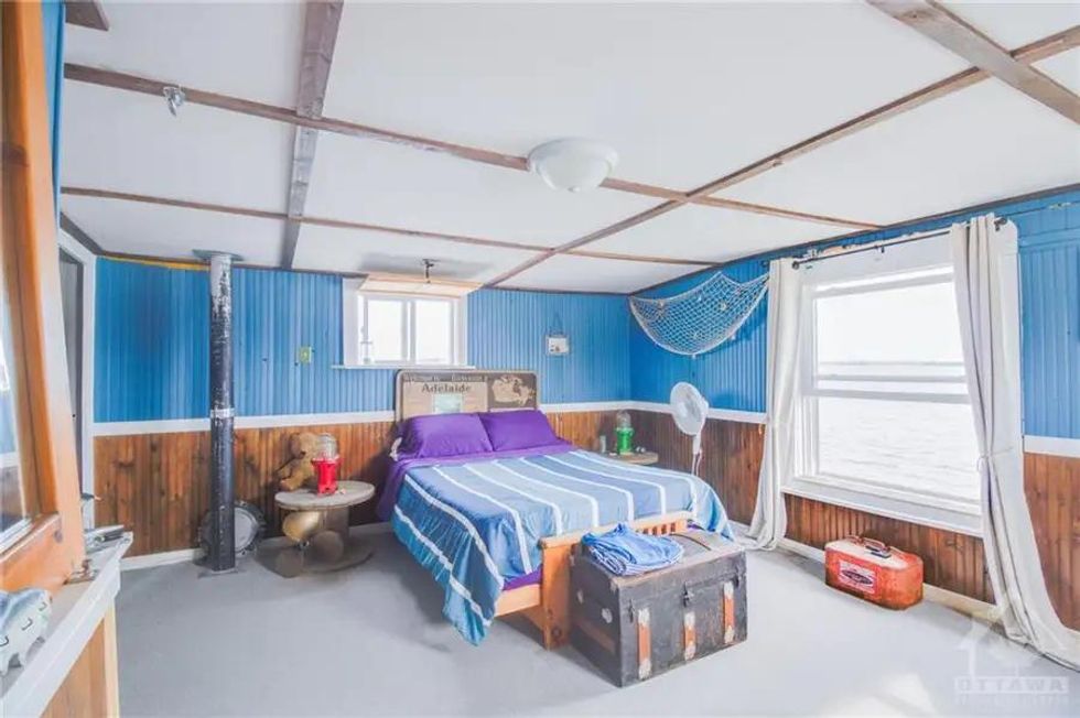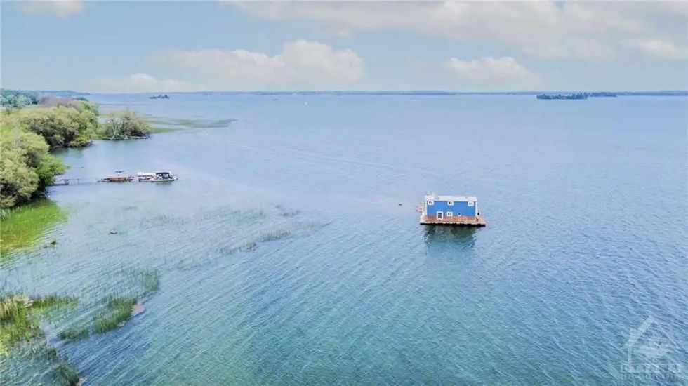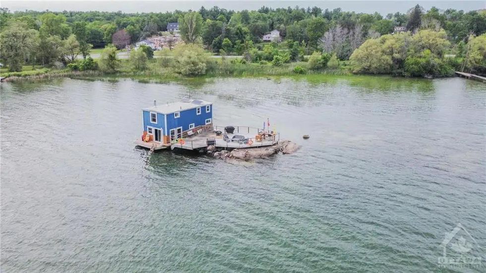 The four-season blue houseboat sits on the St. Lawrence River on "Johnny Buck Rock" island, 900 feet from the shores of Mallorytown. The solar-powered abode comes with a price tag of $399,900.