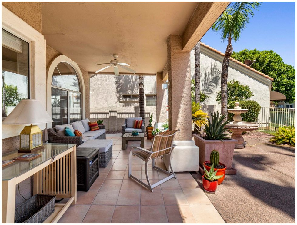 The covered patio features an outdoor fan so you can stay cool, and a small grassy area for your furry friends.