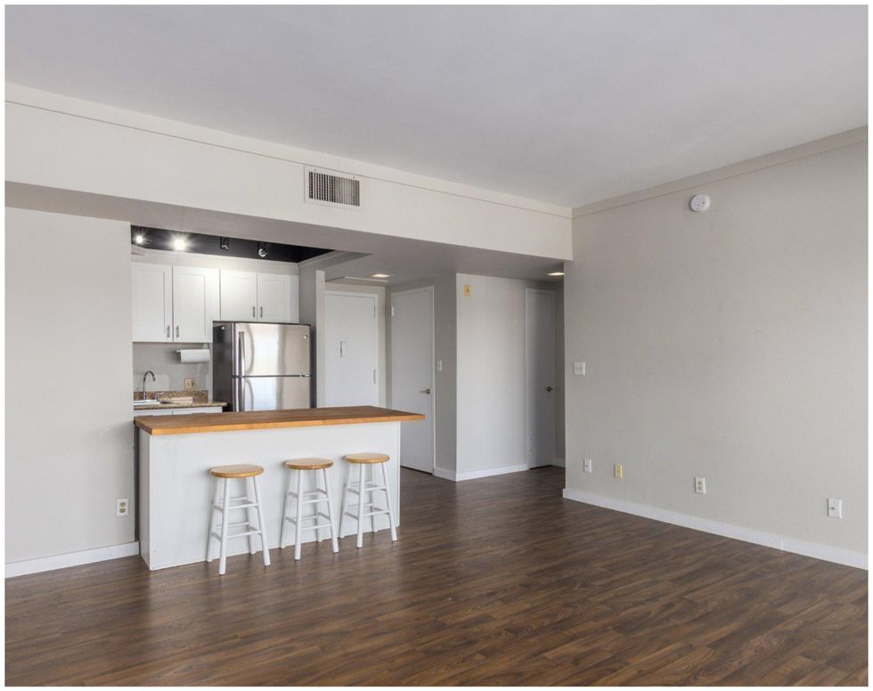 The curved living room has enormous windows with views of the city, timeless decor, and tons of natural light that give the space an airy feel.