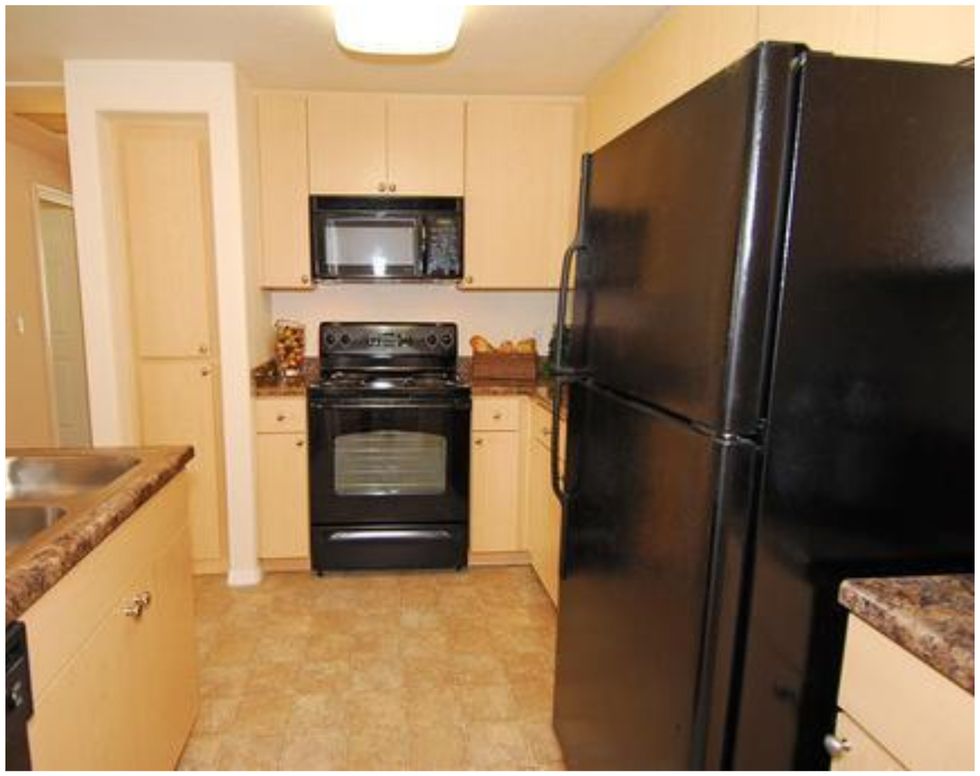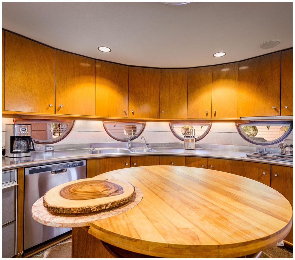 The kitchen boasts the same circular design with stainless steel appliances and cute half-sun windows that give you glimpses of the backyard.