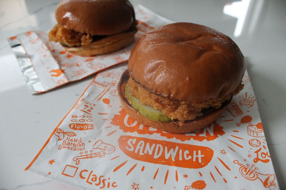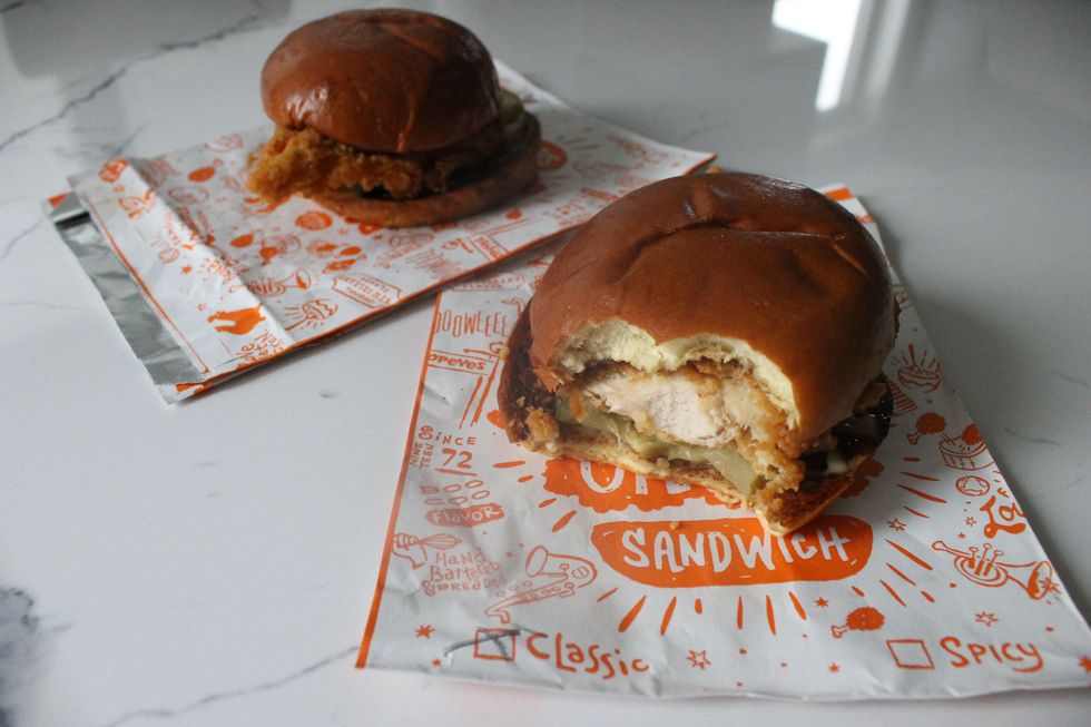 Both kinds have a white meat fillet that's marinated in a blend of Louisiana seasonings then hand-battered and breaded in a buttermilk coating with barrel-cured pickles on a toasted buttery brioche bun but the difference is in the mayo.