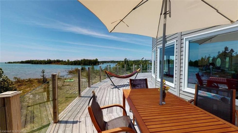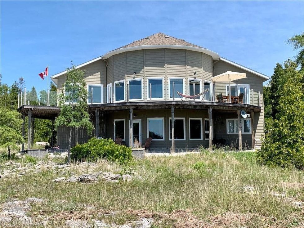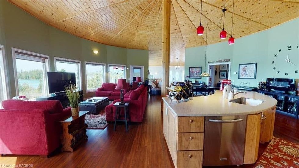You'll never have to go on vacation again after moving into this spot. This home on the market boasts stretching views of a serene lake from a curving upper deck. The uniquely shaped building lets you live in a giant circle surrounded by crystal waters. Ontario's lakefront home for sale is a little piece of paradise.