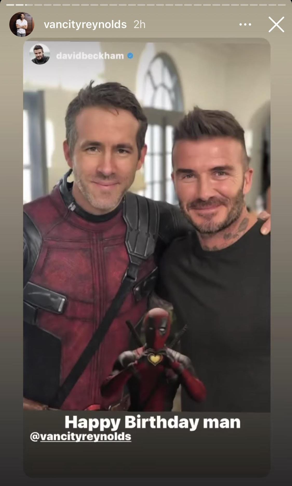 Soccer superstar David Beckham posted this pic on his Insta story of the two men looking particularly dapper, alongside a GIF of Deadpool holding up heart hands.