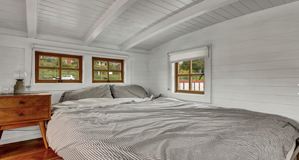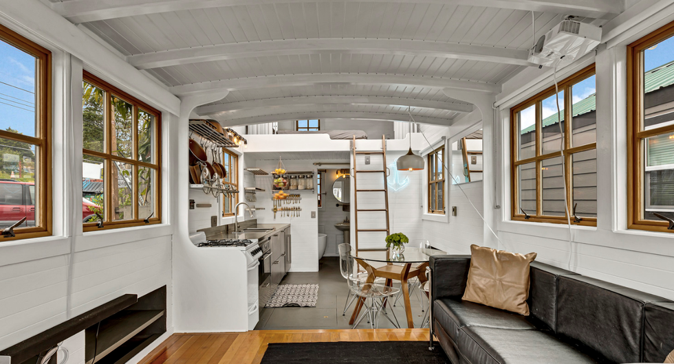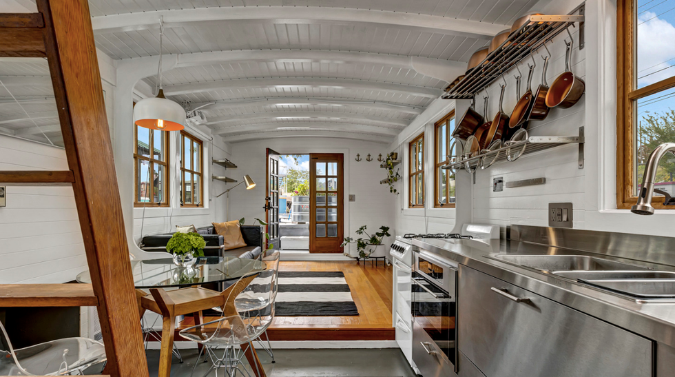 The floating house has been renovated inside with stainless steel appliances and modern touches throughout. It has a lofted one bed, one bath, and is 504 square feet.