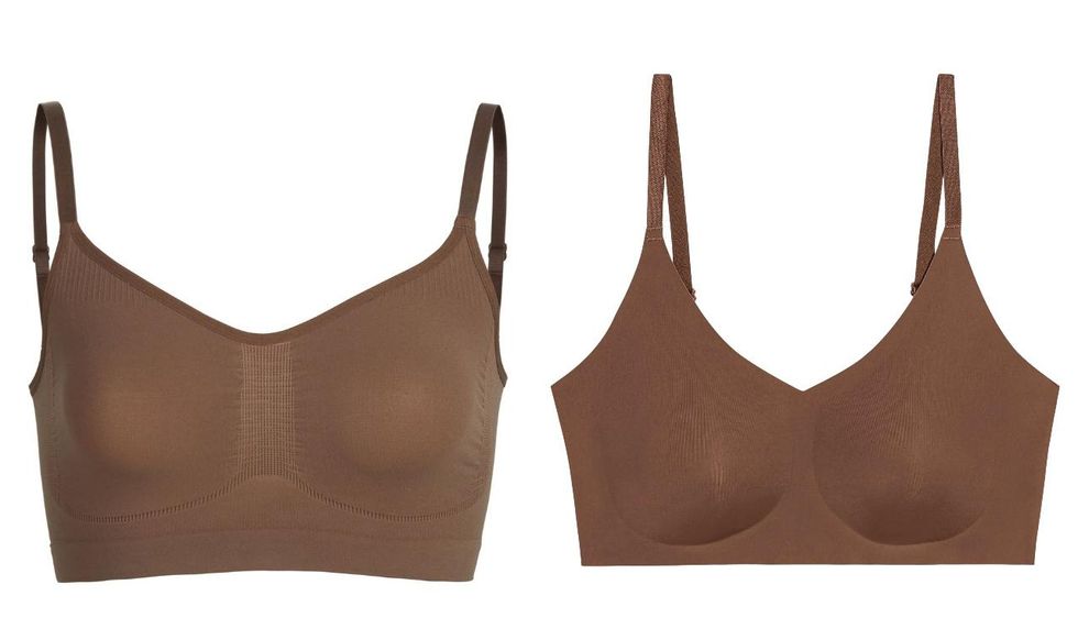 Details: The SKIMS Sculpting Bra (left, $52) and the Joe Fresh bonded bralette (right) both come in a beautiful brown colour. They'll both offer you solid support without awkwardly sticking out because of their seamless nature.