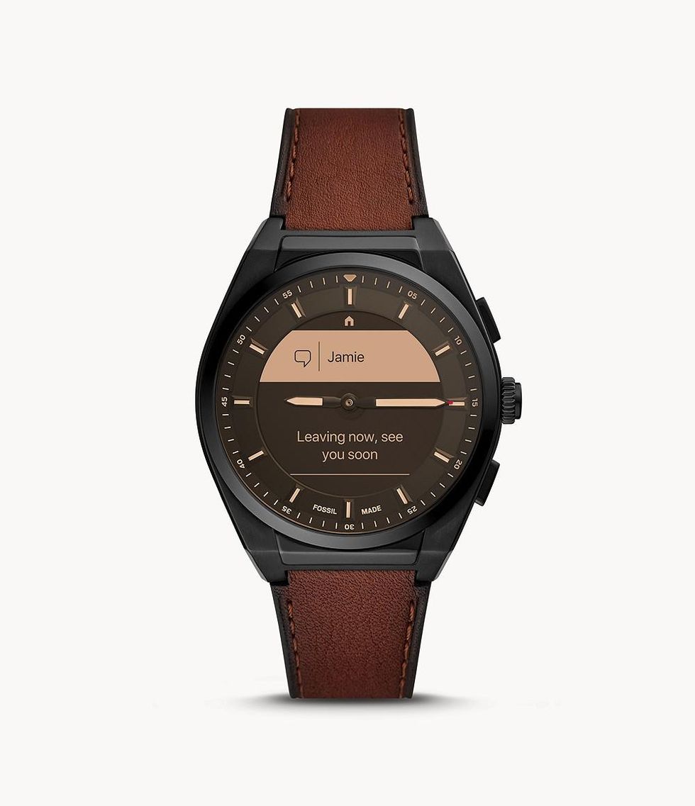 This snazzy smartwatch is perfect for anyone who loves a classic look but appreciates smart features like health tracking and texting. There are four strap options to choose from, including brown or black leather and silver or dark grey stainless steel.